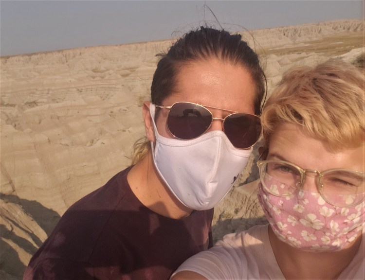 Then came South Dakota, where at our first gas station stop we were the only patrons wearing masks, and a family of four stared us down until we left. Our campground seemed to be hosting a convention of unmasked and unrelated people. It was easy to stay far away from them, but the cultural shift was striking. When Michael ordered a drink at a coffee shop in South Dakota, the woman working the counter said, “What was that? I couldn’t hear you through that muzzle.”